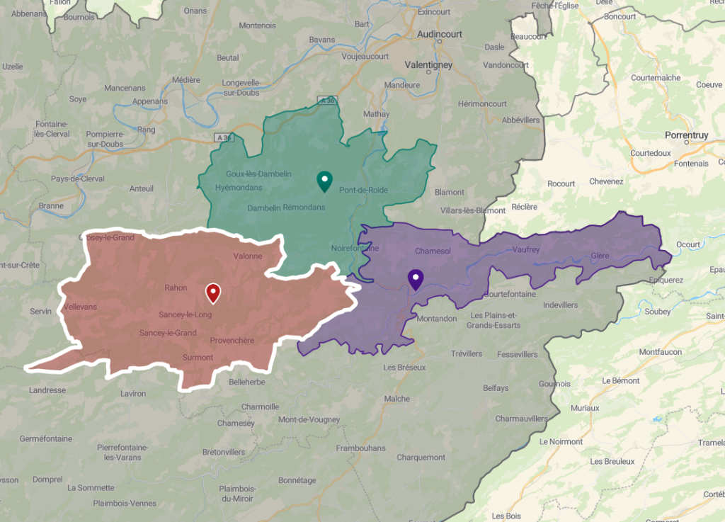 Les communes desservies dans ce secteur incluent : Belvoir, Chazot, Crosey-le-Grand, La Grange, Orve, Ouvans, Peseux, Rahon, Randevillers, Rosières-sur-Barbèche, Sancey, Surmont, Terres-de-Chaux, Valonne, Vellerot-lès-Belvoir, Vellerot-lès-Vercel, Vellevans, Vernois-lès-Belvoir et Vyt-lès-Belvoir.